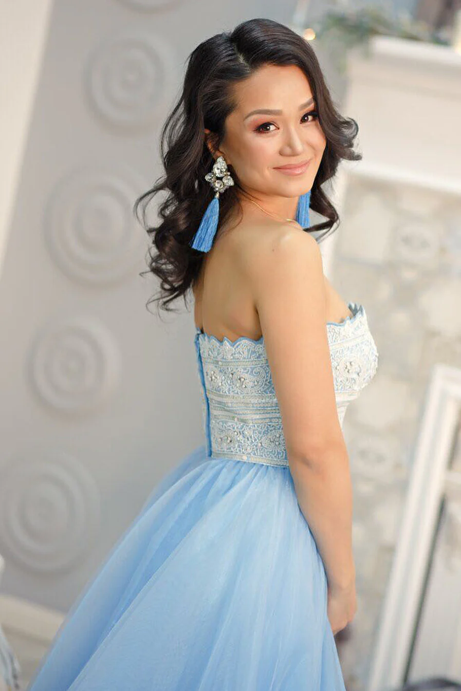 • Princess Strapless Sky Blue Long Tulle A Line Prom Dresses with White Lace OK950
