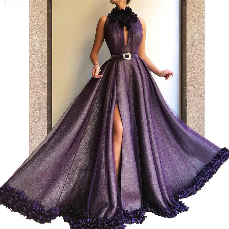 • Purple Long A-line Split Cheap Prom Dress With Flowers OKH56
