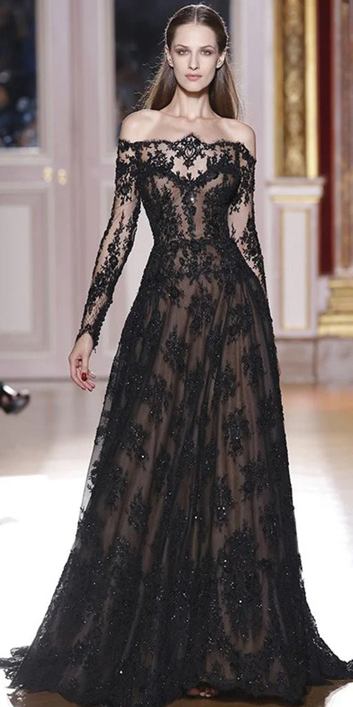 • Romantic Long Sleeves Off the Shoulder Lace Appliques A Line Black Prom Dress OKG33