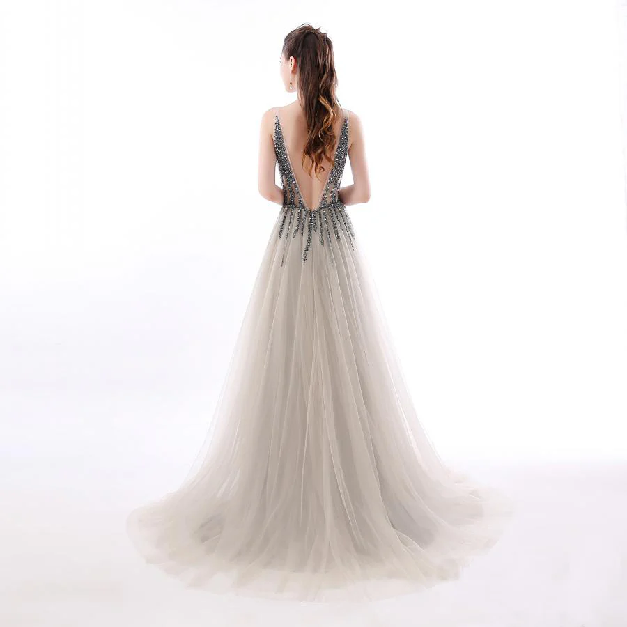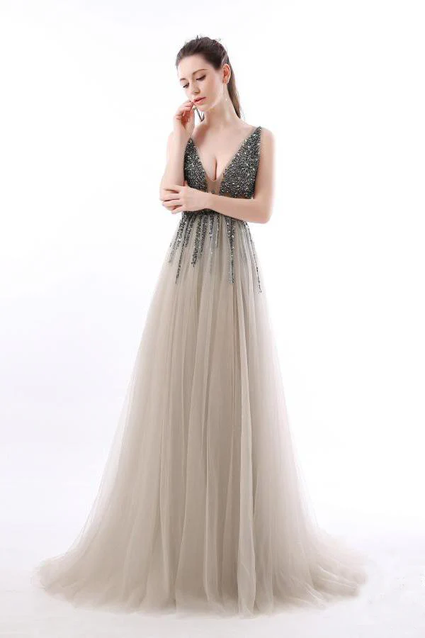 • Sexy A Line Sequin Tulle Long V Neck Backless Formal Prom Dress OKC1