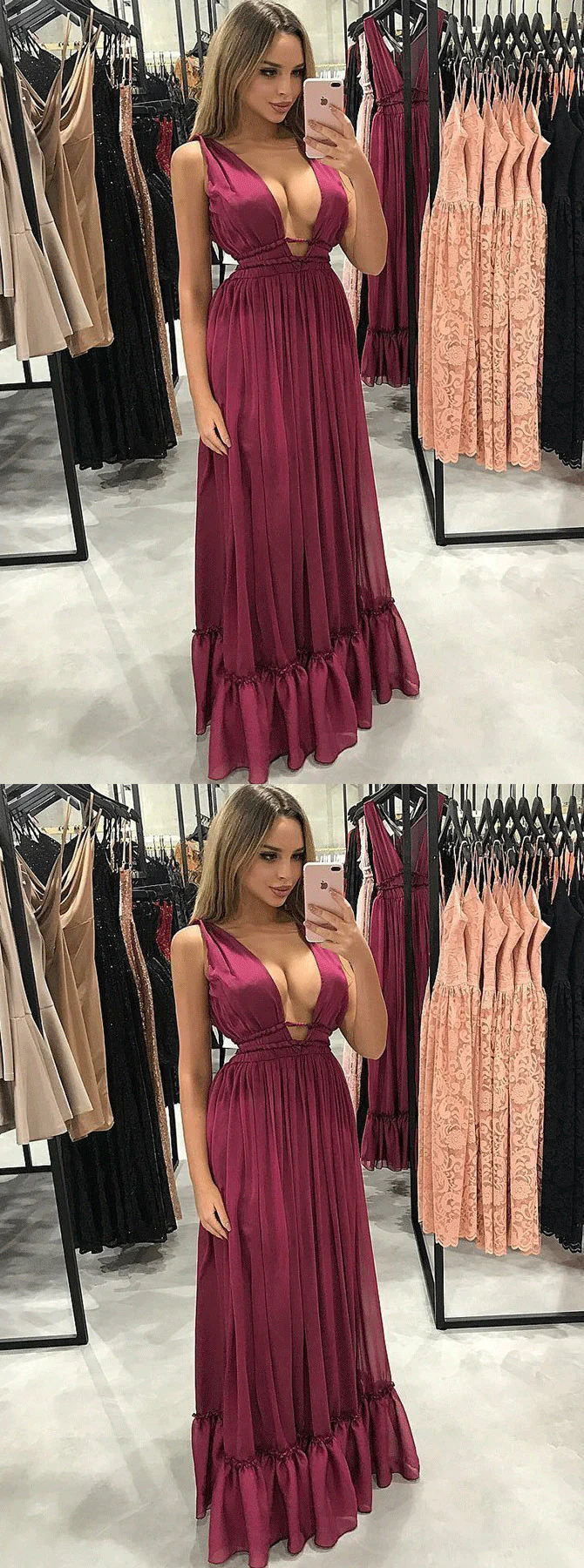 Sexy A-Line V-Neck Pleated Burgundy Chiffon Prom Party Dresses OKF8