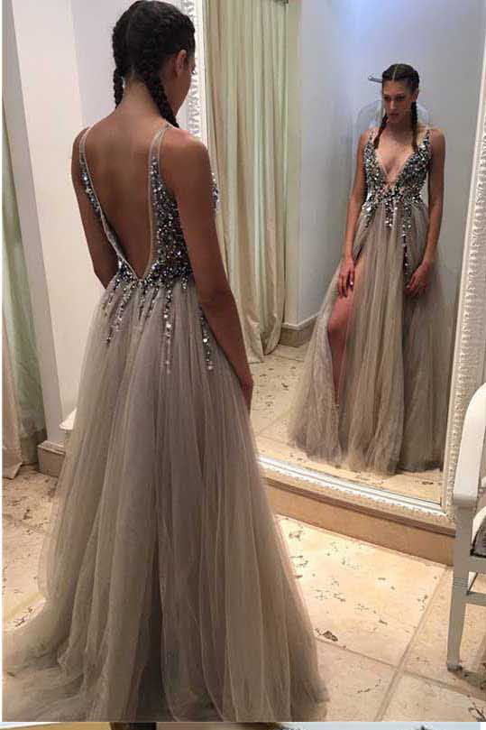 • Sexy Deep V-neck Long A-line Tulle Backless Lace Prom Dress Women Dresses K769