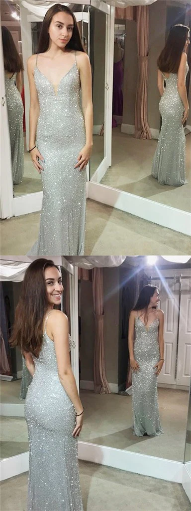 Shiny Mermaid Spaghetti Sheath Silver Long Sexy Prom Dress OKG35