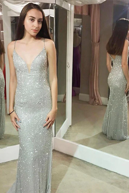 • Shiny Mermaid Spaghetti Sheath Silver Long Sexy Prom Dress OKG35