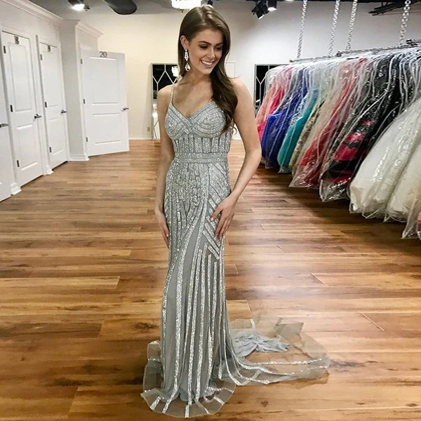 • Silver Beaded Long Spaghetti Strap Mermaid Prom Dress OKE56