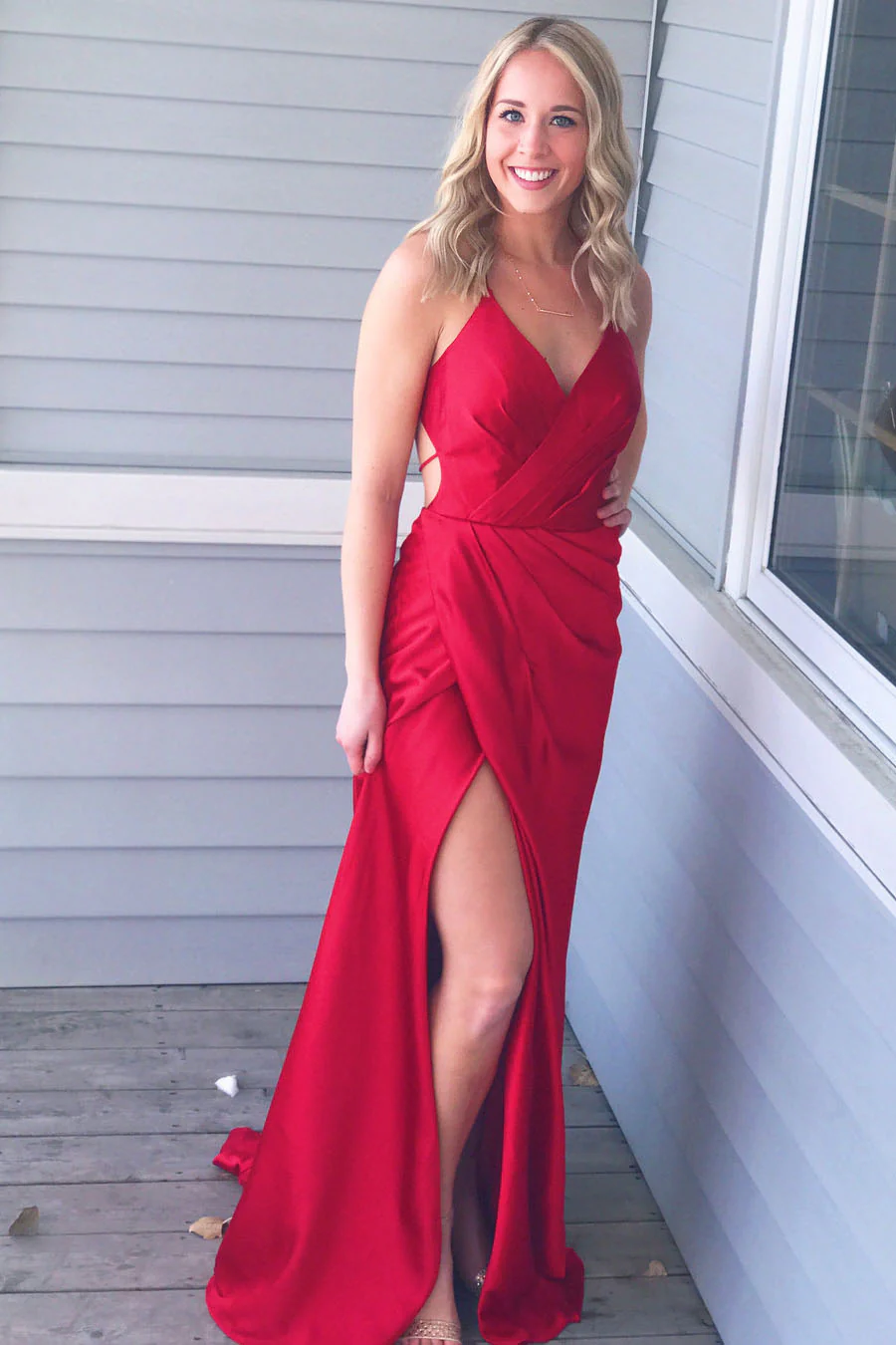 • Simple Red V-Neck Spaghetti Straps Slit Side Formal Prom Dress OK960