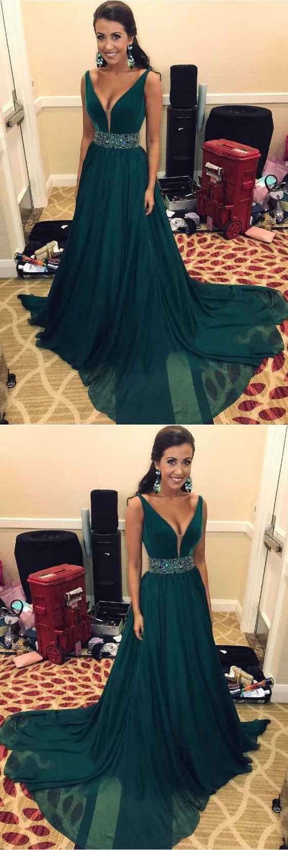• Simple V-Neck Sweep Train Dark Green Chiffon Prom Dresses with Beading OKF67