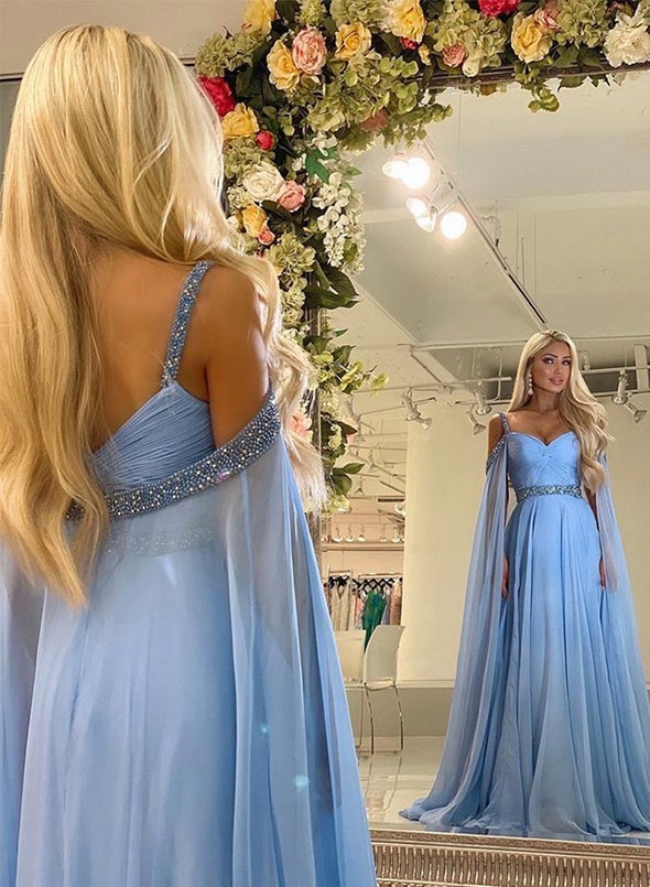 Sky Blue A Line Chiffon Long Prom Dress Beading Evening Dress OK1254