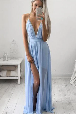 • Sky Blue Chiffon Long V-Neck Spaghetti Straps Simple Prom Dresses OKD72