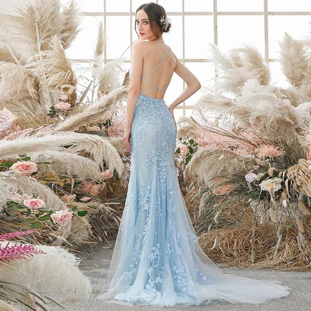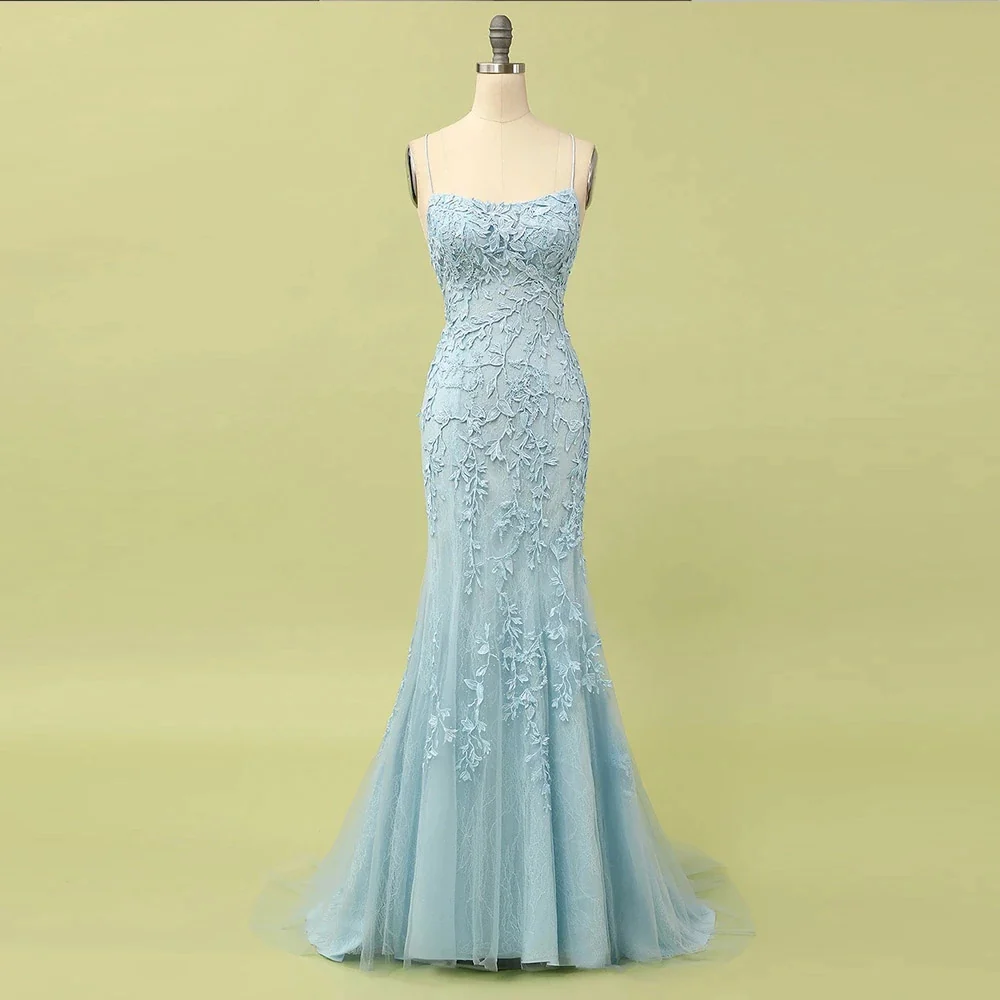 • Sky Blue Long Mermaid Lace Appliques Prom Dress With Rhinestones OKW66