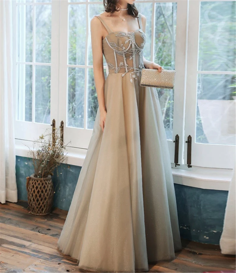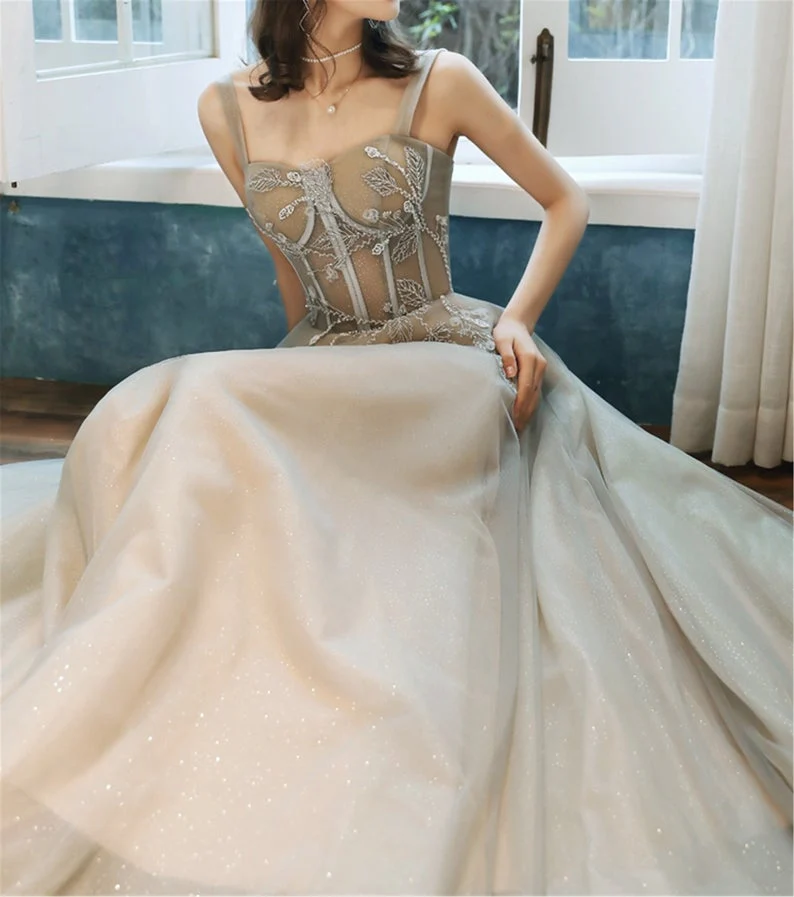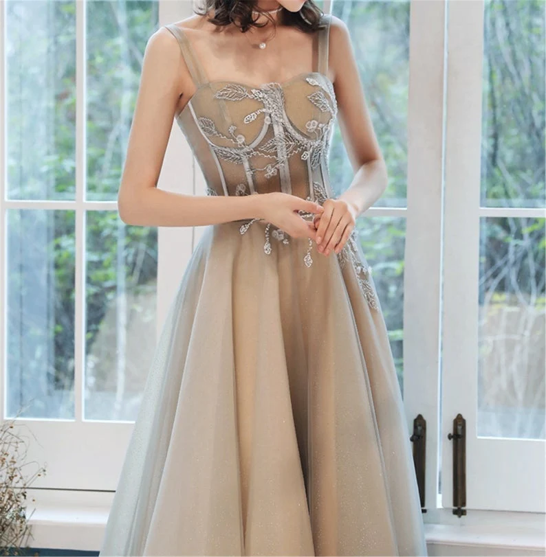 • Spaghetti Straps A-line Long Prom Dress Fairy Tulle Evening Gown OKV86
