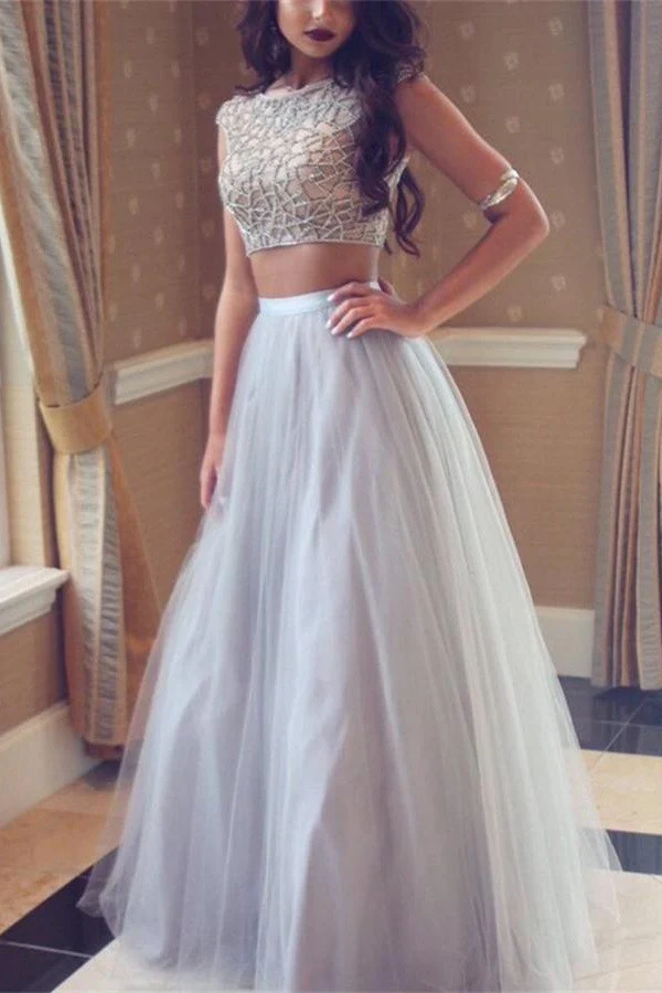 • Sparkly Beaded Two Pieces Modest Long Tulle Party Prom Dress K768