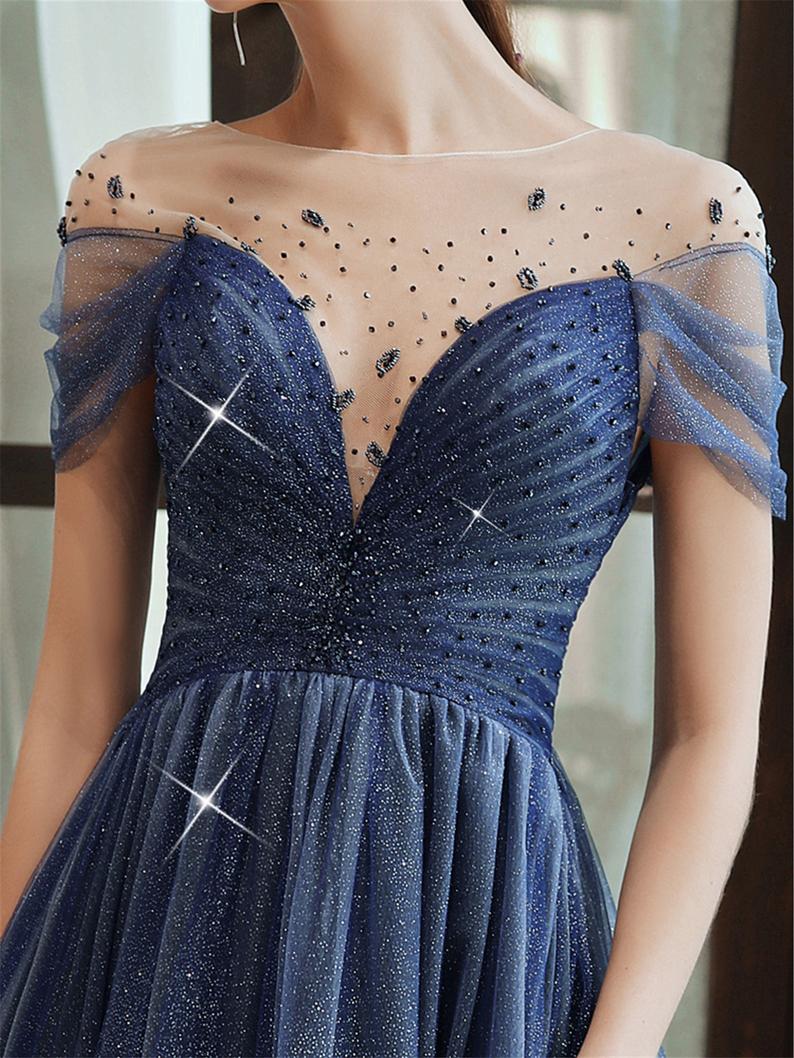 • Starry Blue Off Shoulder Floral Event Dress Sparkling Long Prom Dress Aline Event Dress Gradient Long Dress OKV91