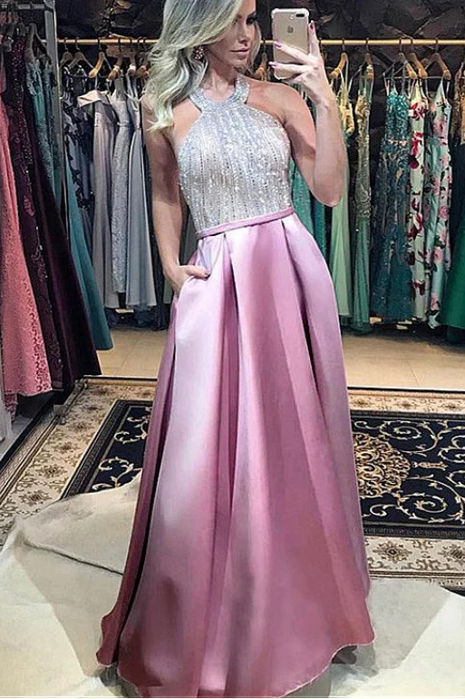 Stunning Beading Pink Halter Backless Prom Dress With Pockets OKG1