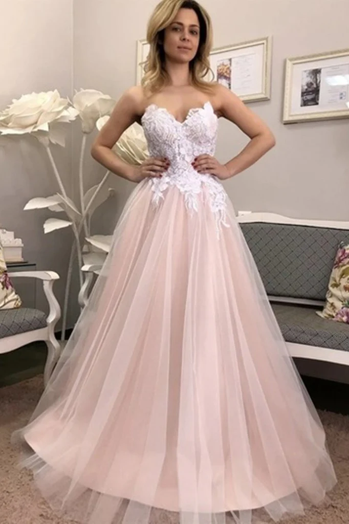 Sweetheart A-line Pink Lace Prom Dress Tulle Long Formal Evening Dress OKZ13
