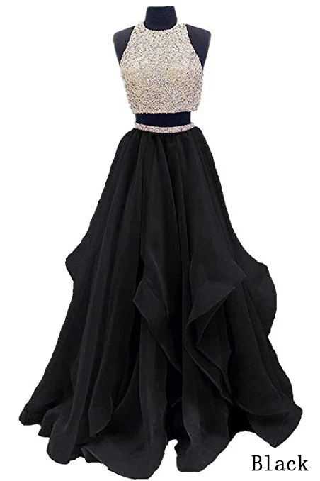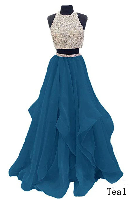 Two Piece Floor Length Burgundy Prom Dresses Beaded Open Back Evening Gown OK603