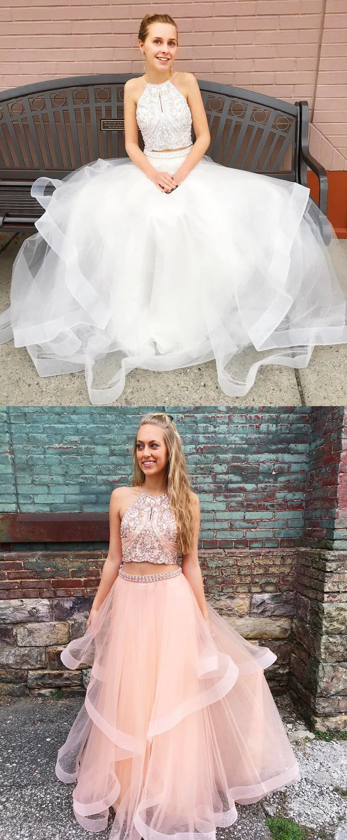 • Two Piece Long Beading Long Tulle Prom Dresses,A Line Evening Dresses OKB21