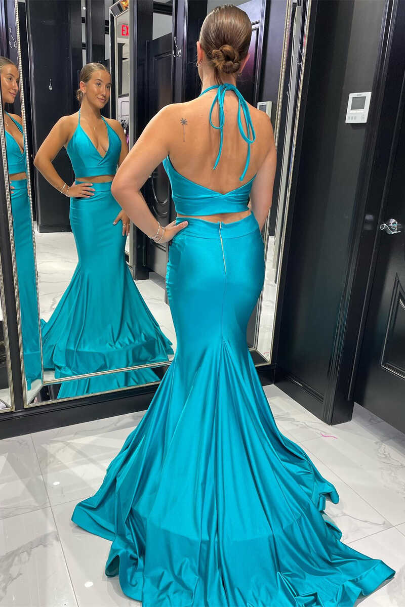 • Two Pieces Teal Blue Halter Mermaid Long Prom Dress Evening Dress OK1530