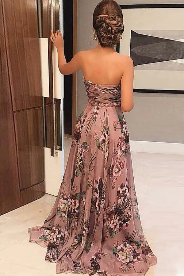 Unique A-Line Sweetheart Sweep Train Floral Printed Chiffon Prom Dress with Beading OKA32