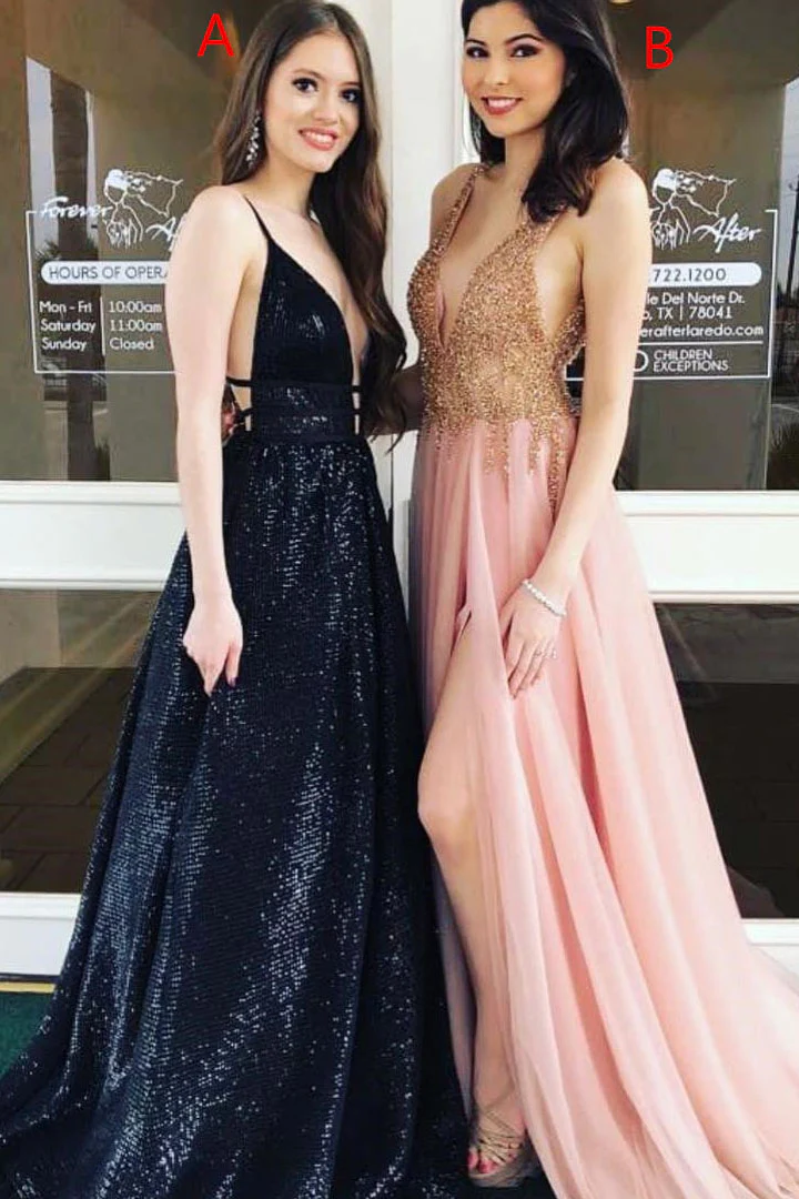 • Unique V Neck Sleeveless A Line Long Formal Prom Dresses OKA10