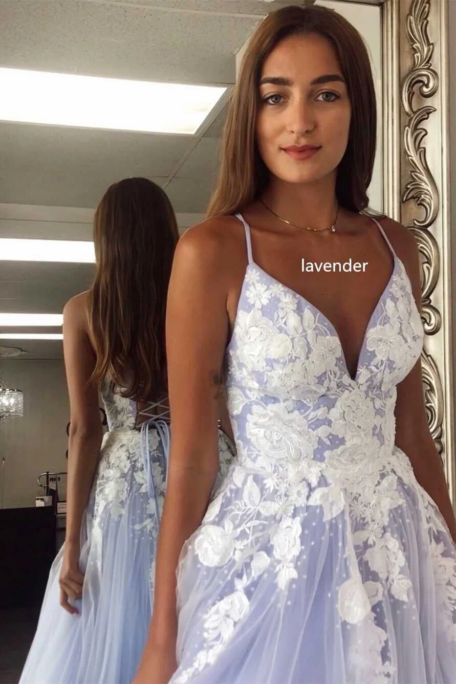 • V-neck A Line Tulle Long Prom Dress Long with Appliques and Beading OK1603