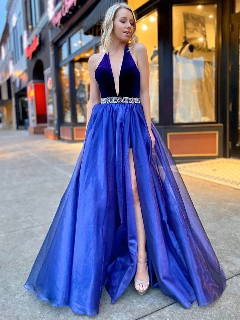 • V Neck Backless Royal Blue Halter Prom Dress Long Beaded Formal Evening Dress OKT59