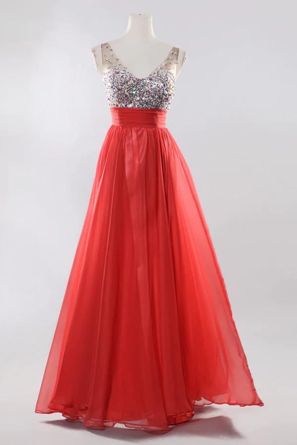 V-neck Beaded Red Long Backless Prom Evening Dresses ED0836