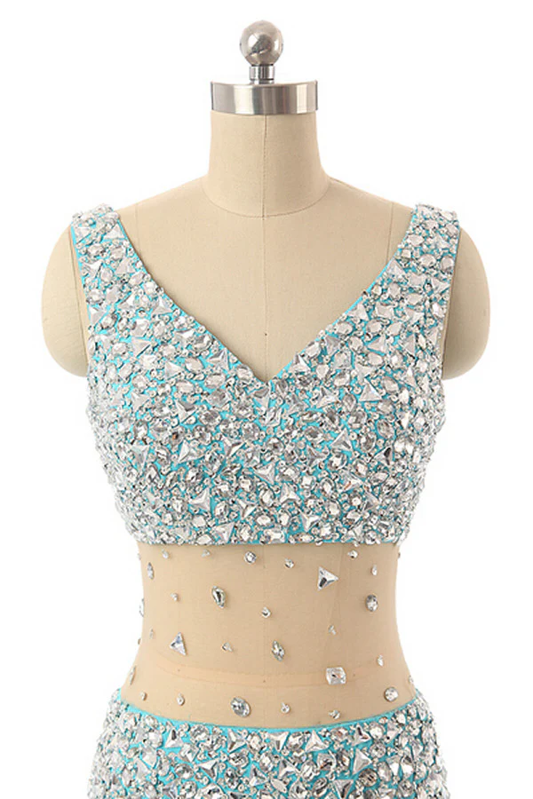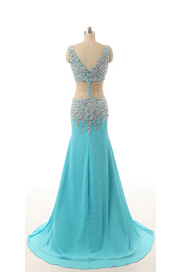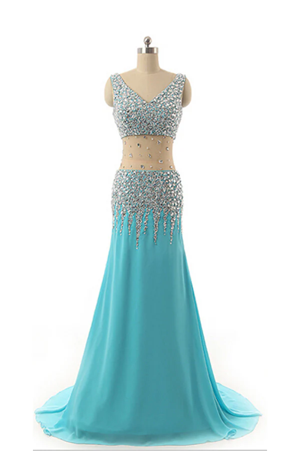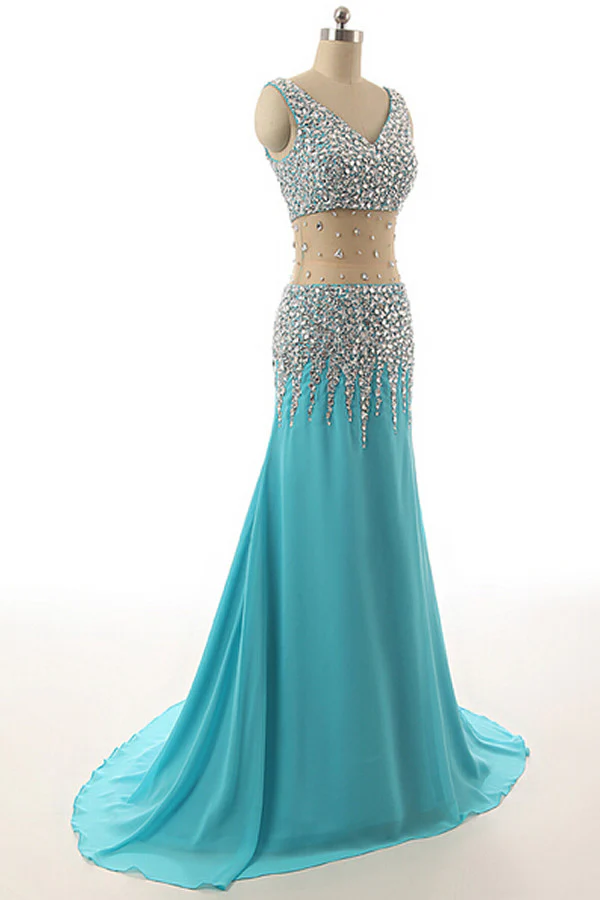 • V-neck Light Sky Blue Beaded Long Prom Evening Dress K14