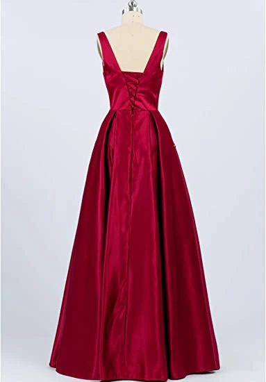 • V Neck Prom Dress with Beads Pockets A-line Burgundy Satin Long Party Dress OKY53