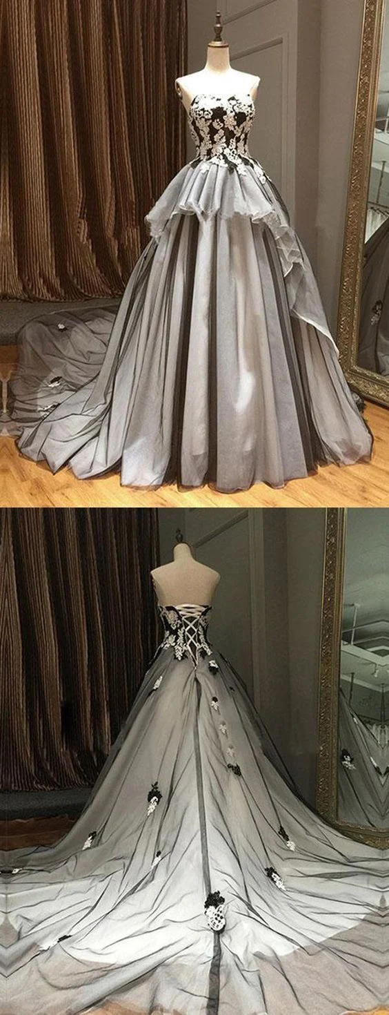 • Vintage A Line Strapless Gray Cheap Appliques Long Prom Dresses OKF69