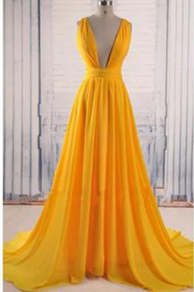 • Yellow A Line V Neck Criss Cross Back Chiffon Long Prom Dresses OKB58