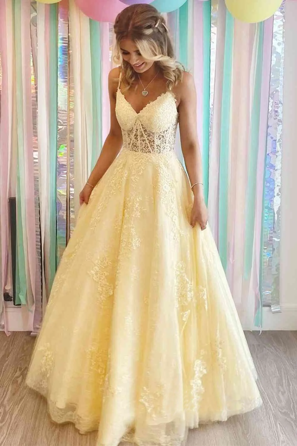 • Yellow Lace Appliques A Line Tulle Prom Dresses Spaghetti Strap Formal Gown OK1971