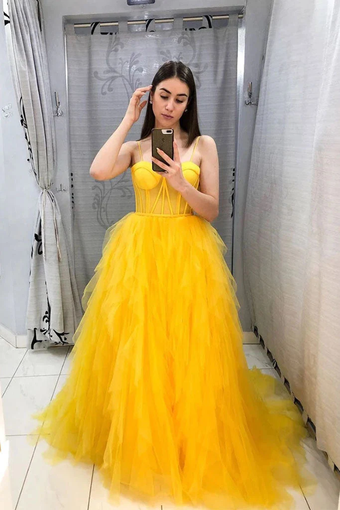 Yellow Tulle Sweetheart Long Prom Dress With Ruffles Evening Dress OKT39