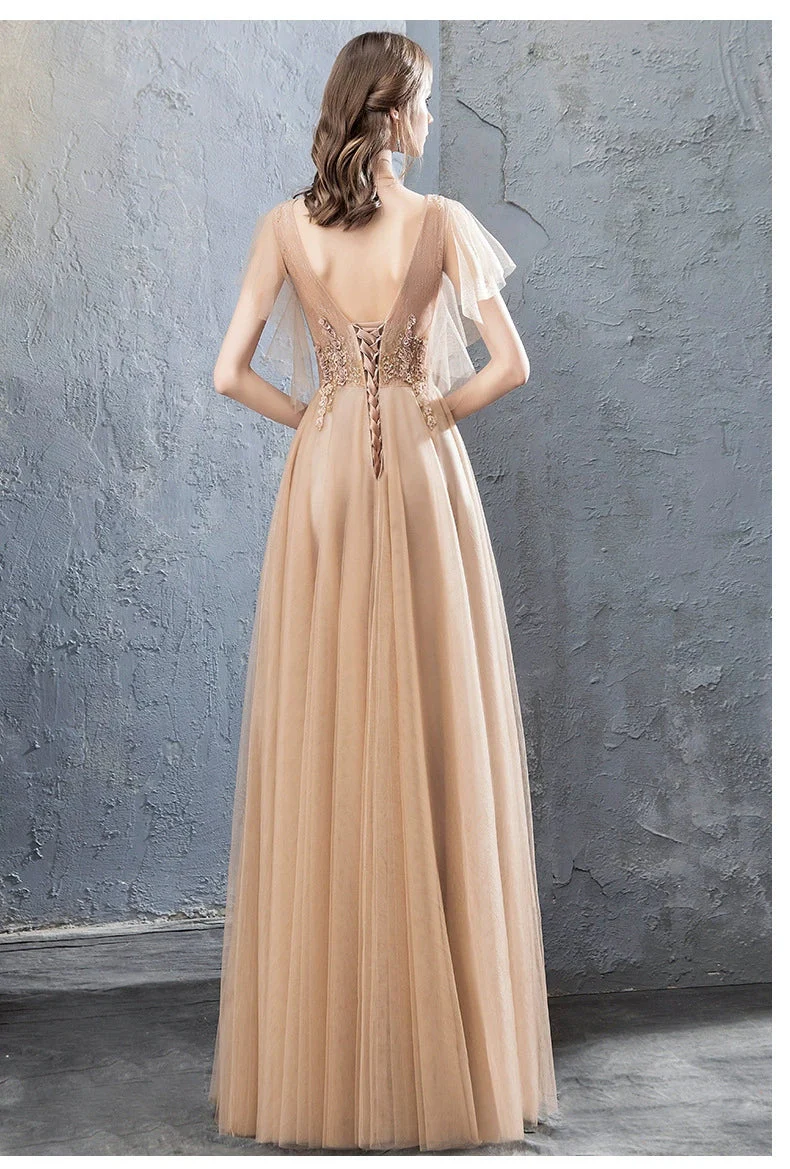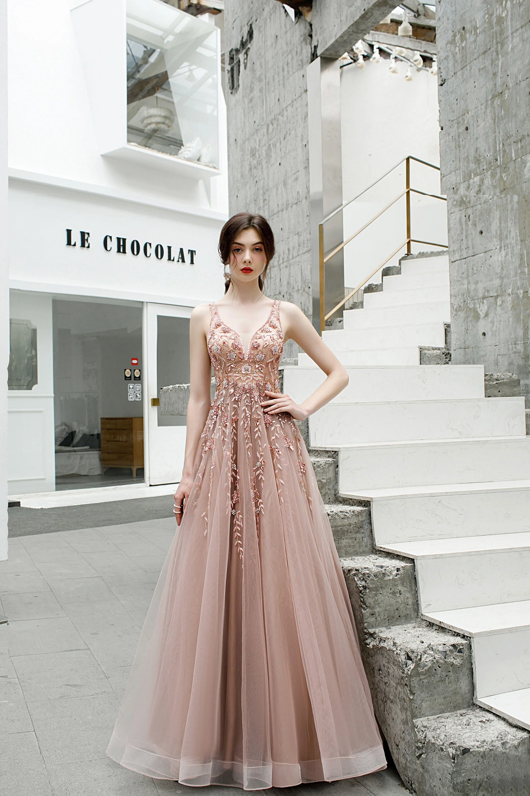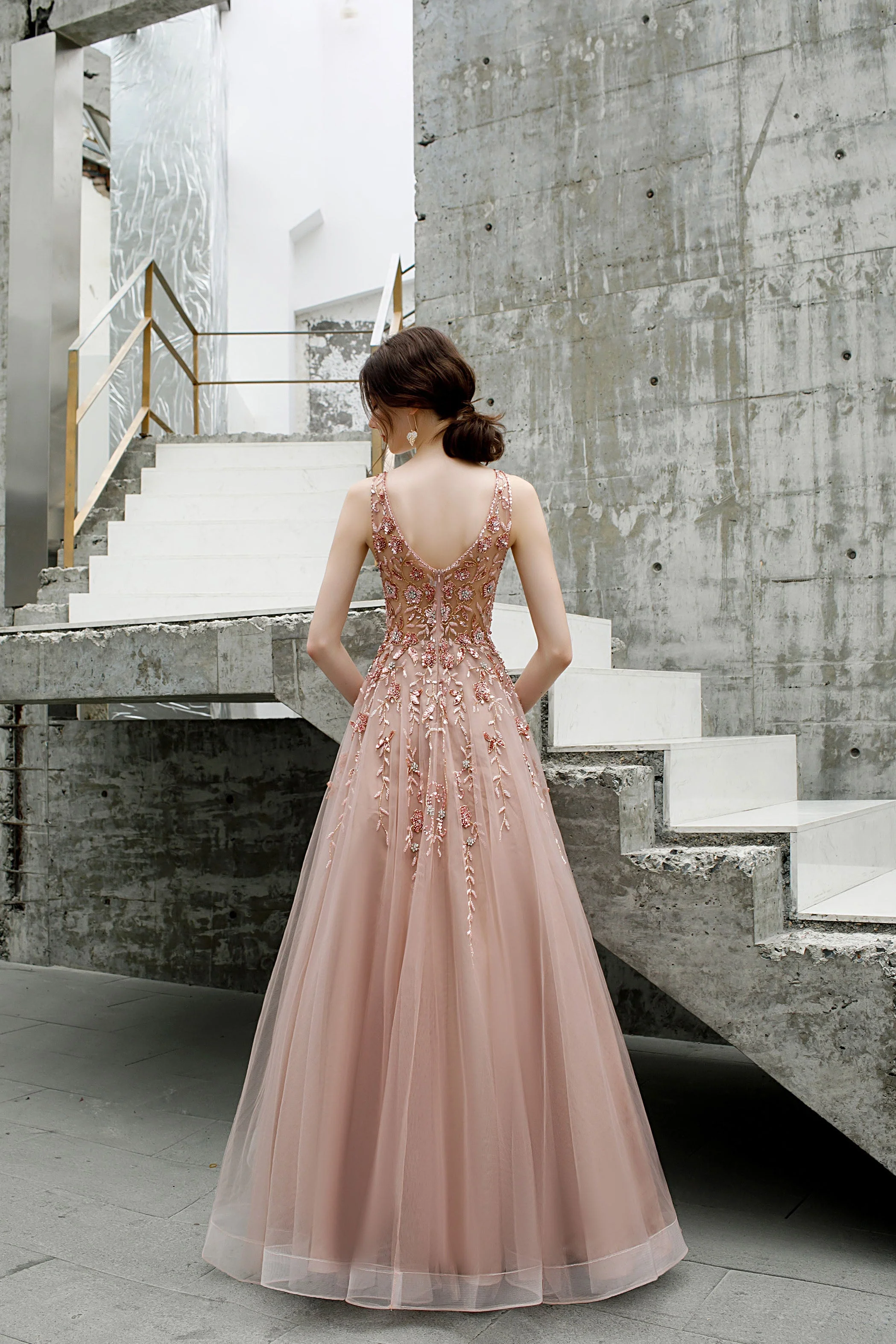 A-line V Neck Beaded Long Tulle Zipper Back Prom Dress OKT24