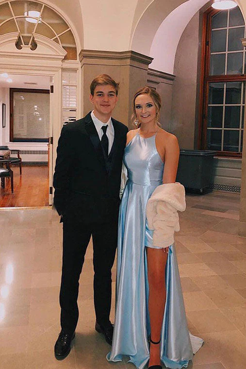 Light Blue Satin Split Long Simple Prom Dress Formal Party Dress OKT46