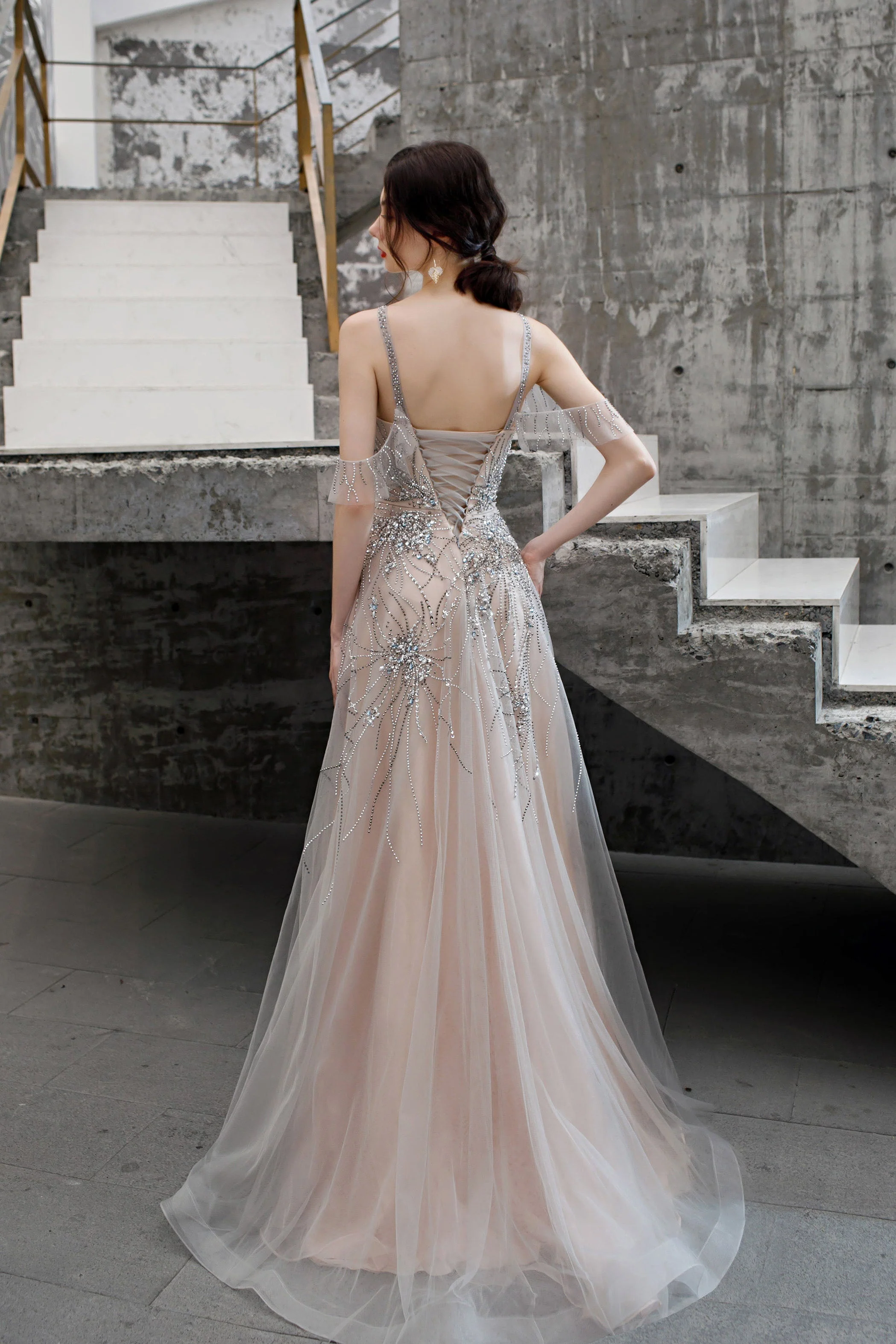 A-line Spaghetti Straps Beaded Long Tulle Prom Dress OKT23