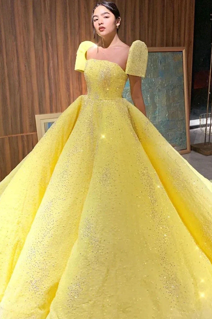 Ball Gown Sparkly Yellow Short Sleeves Prom Dress Evening Dress OKT15