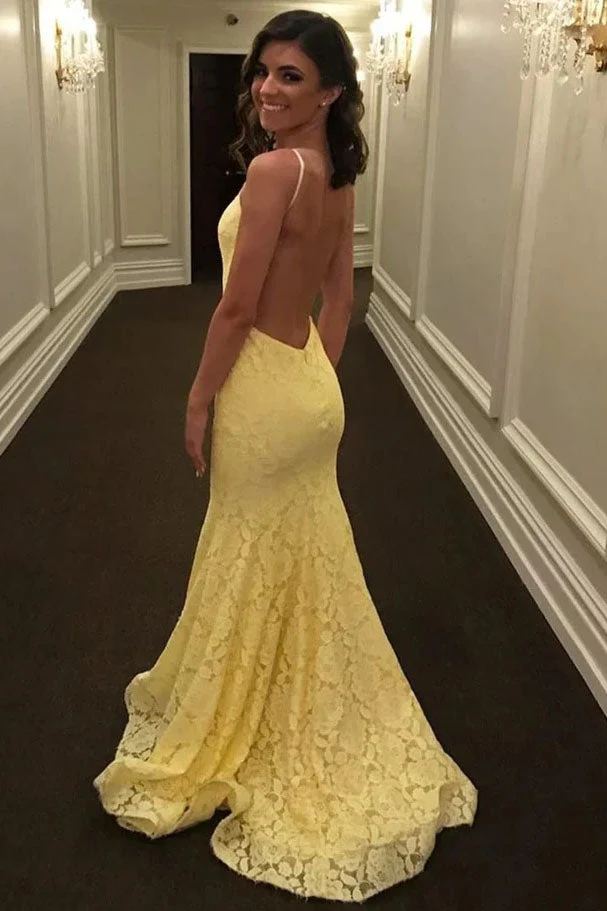 Stunning Mermaid Spaghetti Straps Lace Yellow Long Prom Dress Evening Dress OKT20
