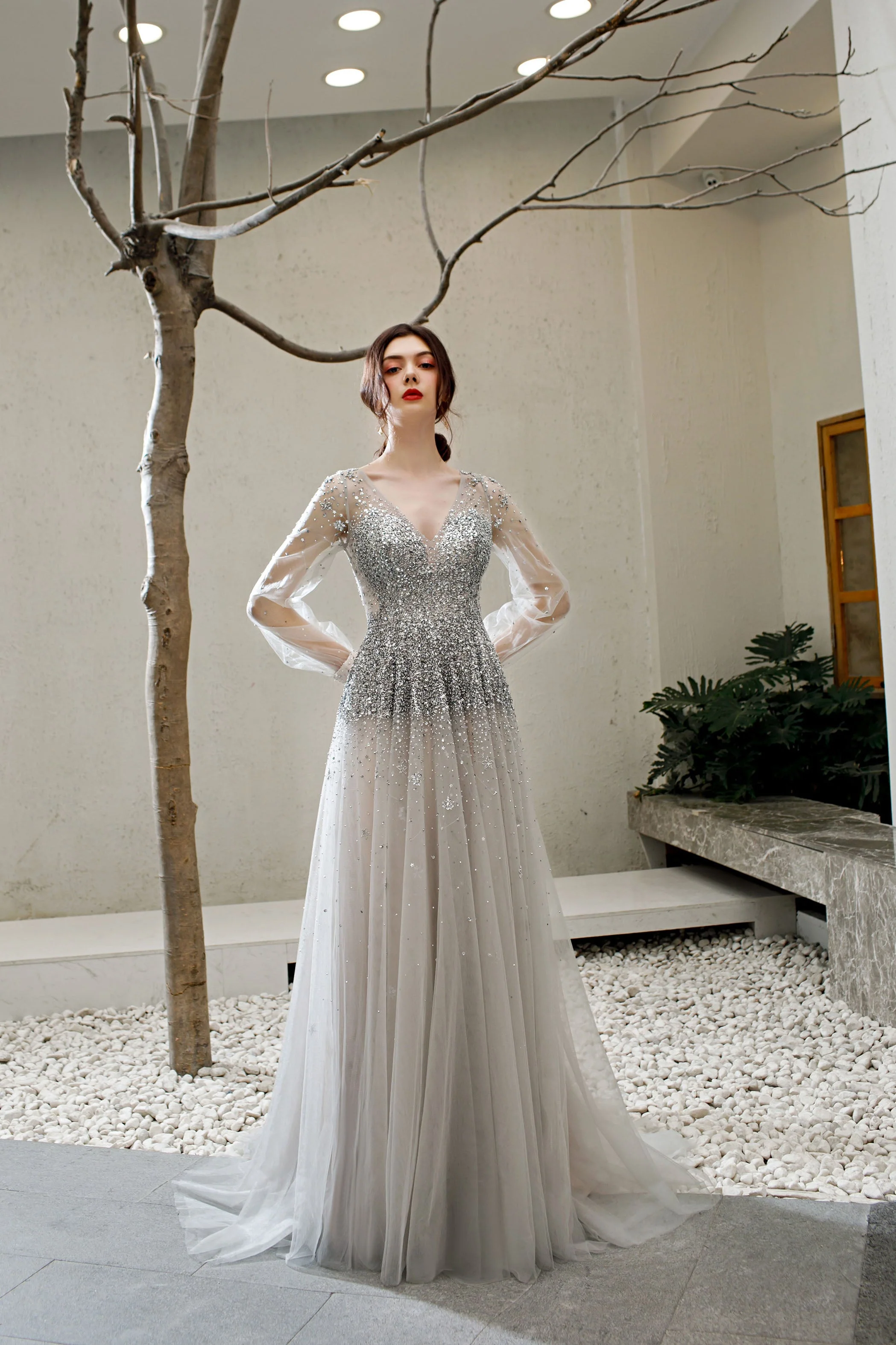 A-line V Neck Long Sleeves Tulle Sequins Grey Prom Dress OKT28