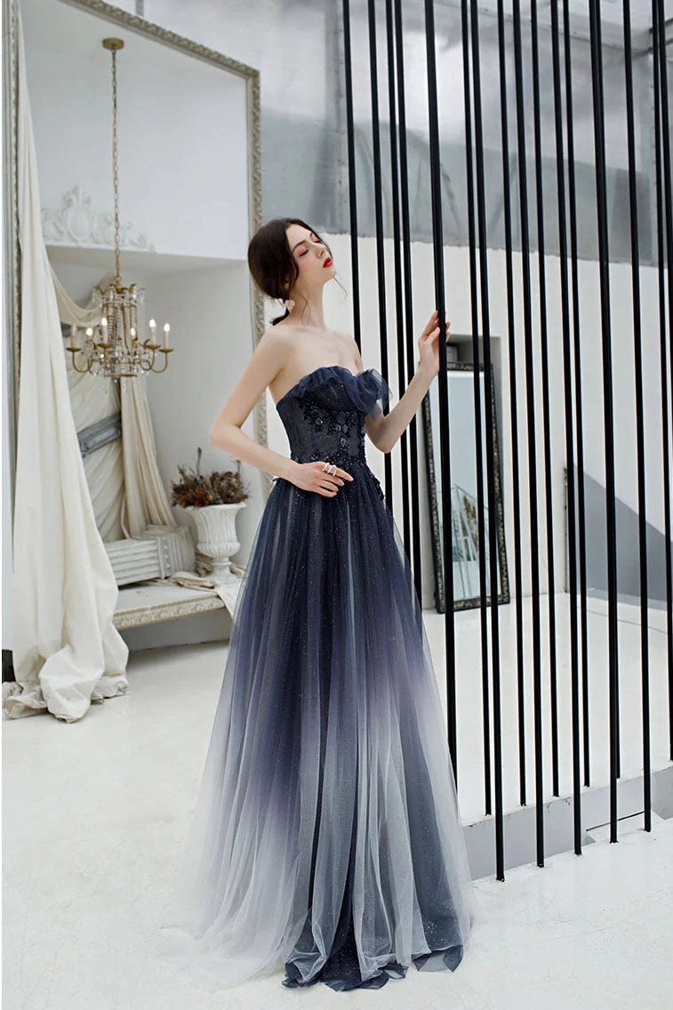 Sweetheart A-line Ombre Color Long Tulle Appliques Prom Dress OKT27