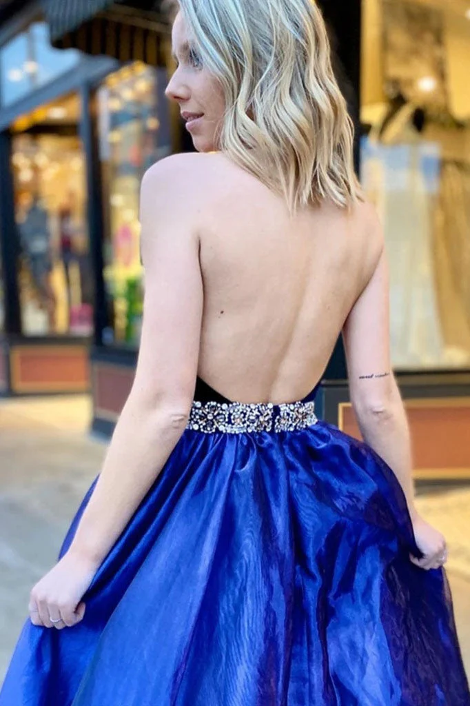 V Neck Backless Royal Blue Halter Prom Dress Long Beaded Formal Evening Dress OKT59