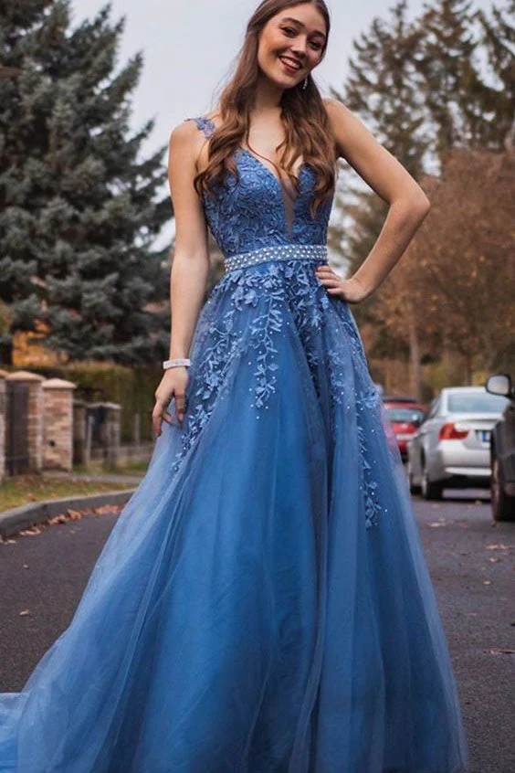 A-line Blue Long Beaded Prom Dress Formal Lace Appliques Prom Gowns OKT42