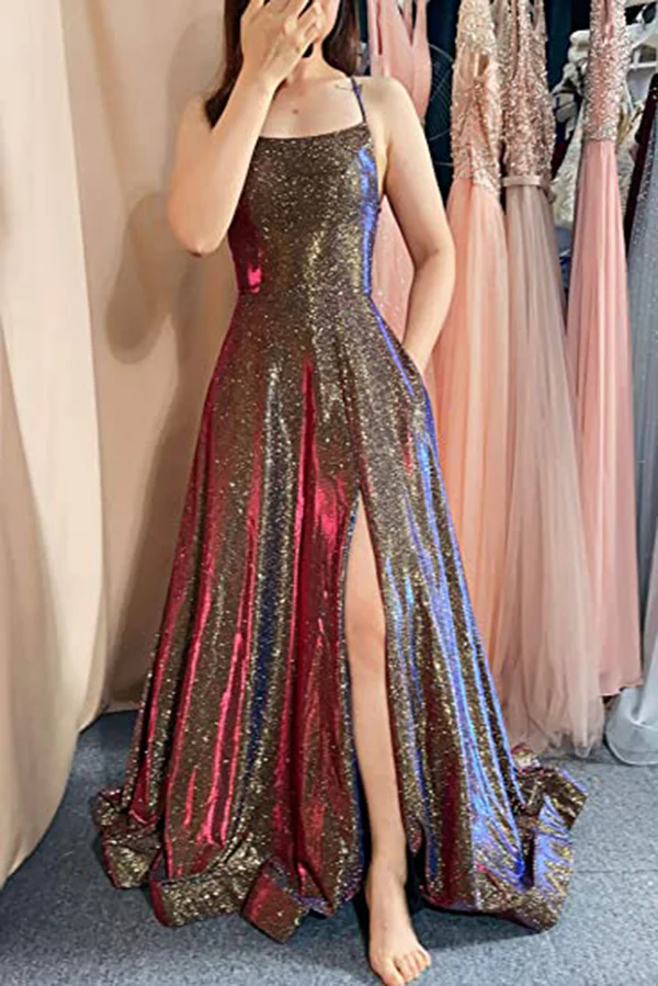 Long A-line Prom Dress with Pockets Formal Evening Ball Gowns Side Slit Glitter Party Dress OKY42