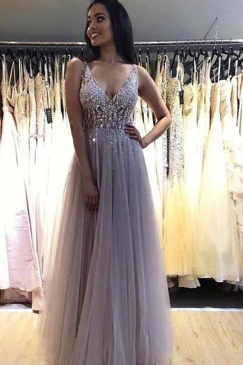 Gray Blue V Neck Tulle Beads Long Prom Dress A-line Appliques Formal Evening Dress OKY10