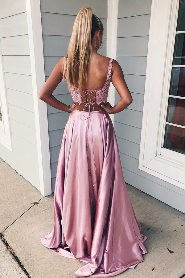 Two Piece Square A Line Pink Split Long Prom Dresses with Lace Pockets OKI72