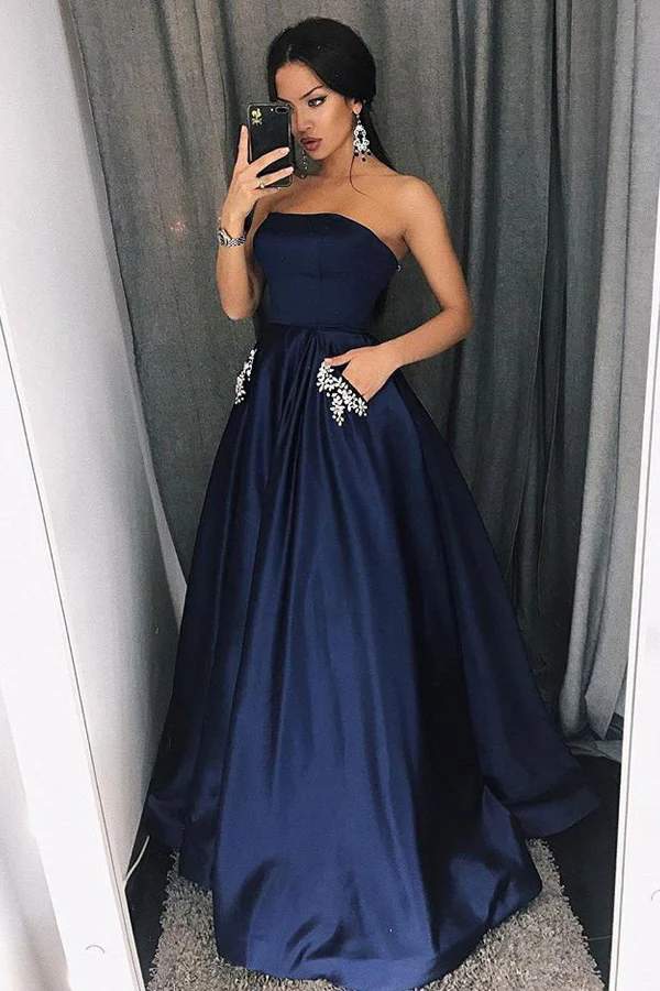Simple A-Line Strapless Floor-Length Dark Blue Prom Dresses with Pockets Beading OKI98