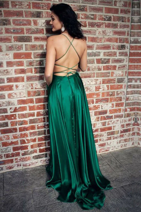 A Line Green Straps Criss Cross Back Long Prom Dress with Pockets OKI62
