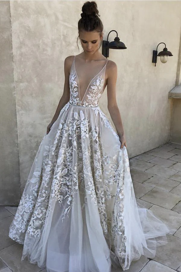 Spaghetti Strap V Neck Wedding Dress,Cheap Elegant Prom Dress OKI85