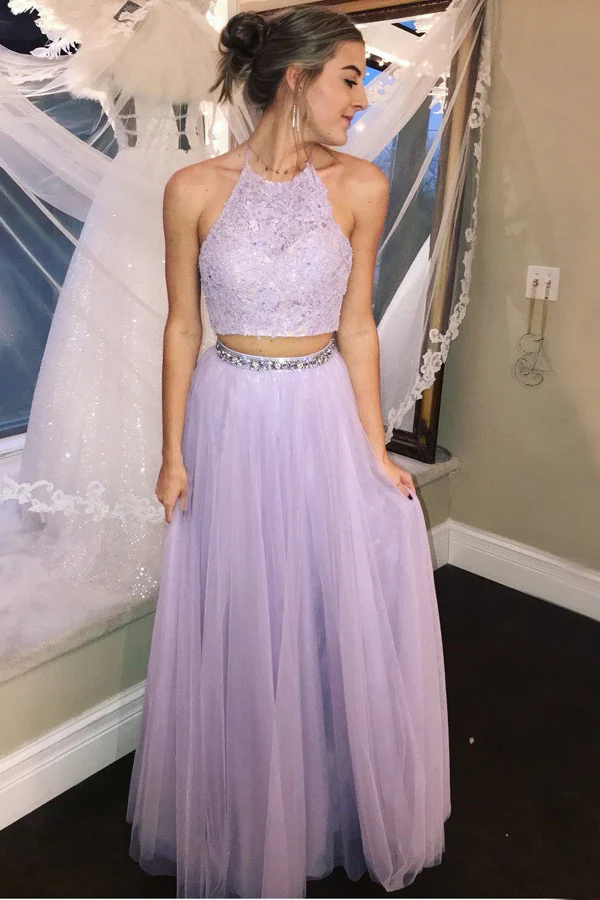 Two Piece Halter Backless Tulle Lavender Prom Dresses with Lace Beading OKI75