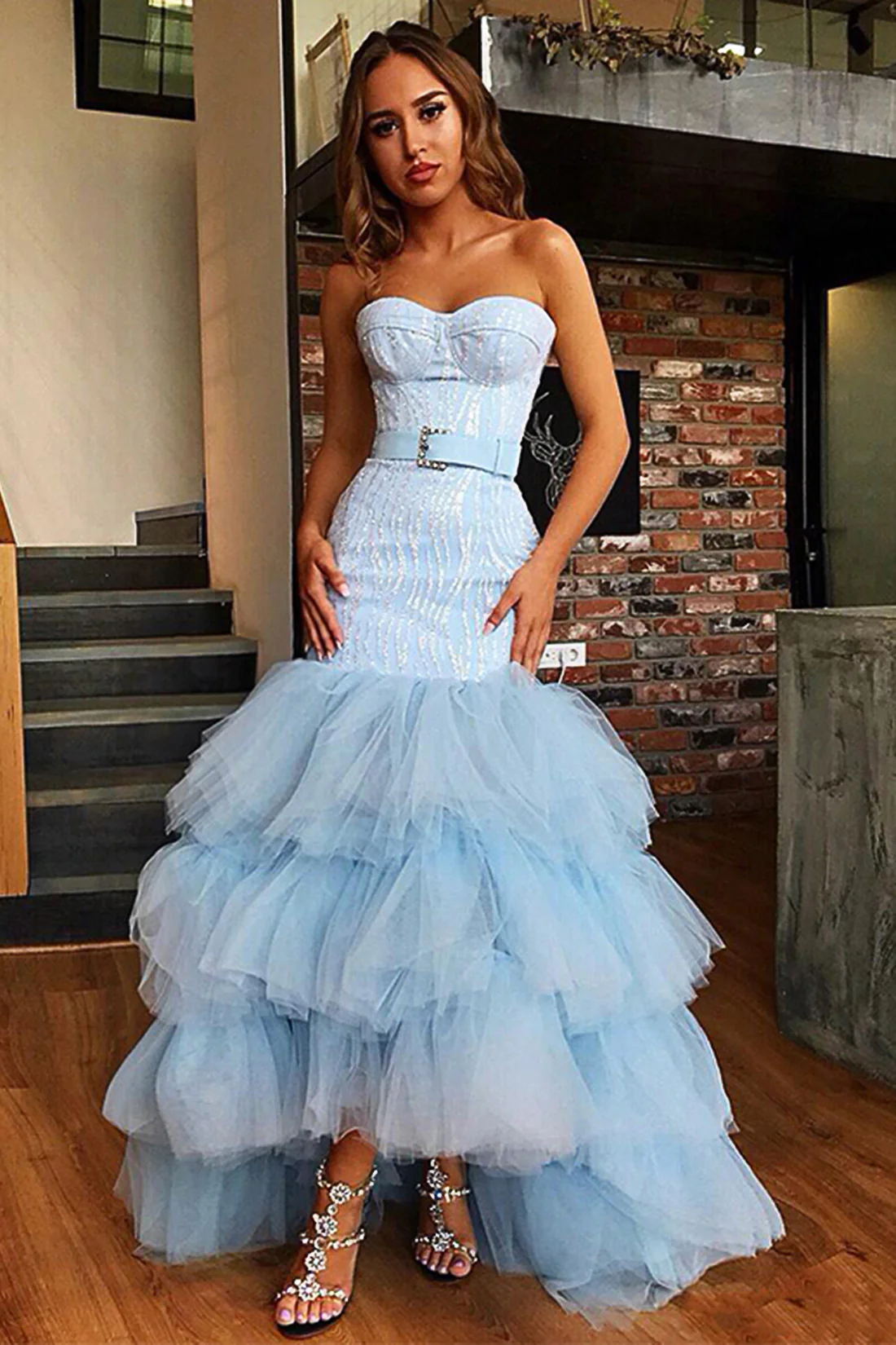 Sky Blue Tulle Sweetheart Neck Long Layered Evening Dresses Cheap Prom Dresses OKI47